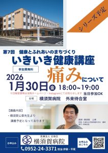 お知らせ ホーム お知らせ 1月30日(金)いきいき健康講座のご案内 2026.01.13 インフォメーション 1月30日(金)いきいき健康講座のご案内 第7回 健康とふれあいのまちづくり いきいき健康教室を開催します。 テーマ:「痛みについて」(50分程度の予定) 講師:横須賀公章先生 所属:久留米大学病院整形外科講師 ※横須賀病院非常勤医師 日時:1月30日(金)18:00~19:00 場所:横須賀病院 外来待合室 申し込み方法:外来受付、電話、QRコードにて行っていますが当日参加もOKです。 参加費:無料 みなさまのご参加をお待ちしております。 前の記事 一覧