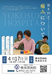 お知らせ ホーム お知らせ 4月17日(金)第8回いきいき健康講座のご案内 2026.04.07 インフォメーション 4月17日(金)第8回いきいき健康講座のご案内 第8回 健康とふれあいのまちづくり いきいき健康教室を開催します。 テーマ:「痛みに対しての予防~リハビリと運動~」(50分程度の予定) 講師:理学療法士 藤村論史 所属:医療法人公和会 横須賀病院 日時:4月17日(金)18:00~19:00 場所:横須賀病院 外来待合室 申し込み方法:外来受付、電話、QRコードにて行っていますが当日参加もOKです。 参加費:無料 みなさまのご参加をお待ちしております。 前の記事 一覧